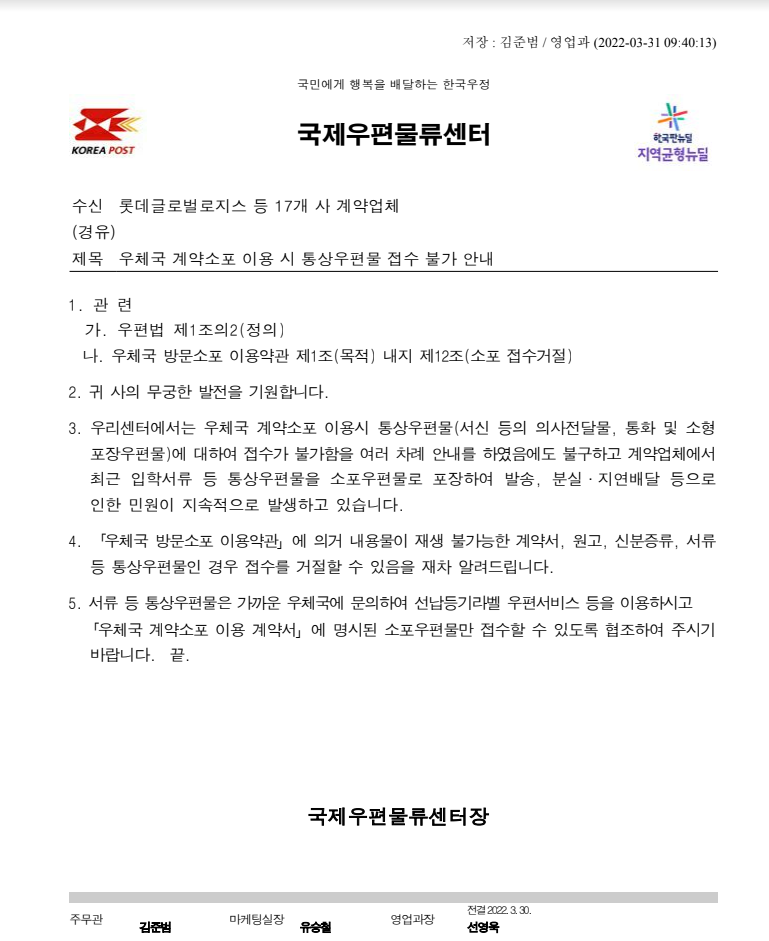 안녕하세요, 우체국소포 서류접수불가 공문 전달받아 안내 드립니다. 서류의 분실시 우체국 손해배상근거의 불명확(서류는 상업적가치의 판단 불가) 및 개인적 중요서류의 분실로 인핸 피해보상불가( (예) 대학입학서류 등) 등으로 민원처리에 어려움이 있다고 합니다. 하여 우체국에서 소포의 서류접수를 더 이상 하지 않는다고 합니다. 추후 입항건 중 서류는 박스포장으로 보내주시길 바랍니다. 서류 형태로 입항 될 시 분류과정에서 시간이 다소 걸릴 수 있으므로 포장은 꼭 박스형태로 보내주시길 바랍니다. 만약, 우체국 분류 과정에서 서류 집화 될 경우 반송처리 될 수 있으며 분실 및 데미지 발생시 보상이 불가하오니 참고 부탁드립니다. 확인 부탁드립니다. 감사합니다.